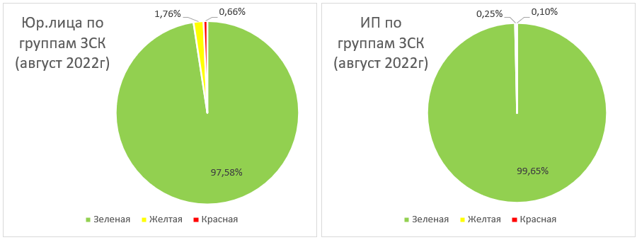 Списки организаций с подозрительными операциями рассылаются коммерческим банкам, а также в ФНС по каналам ЦБ. По нашим данным на начало августа 2022 года в зеленой зоне было 3,1 млн. юридических лиц (ЮЛ) и 3,8 млн. ИП, в желтой зоне – 56 тыс. ЮЛ, 8 тыс. ИП, в красной зоне – 21 тыс. ЮЛ, 4 тыс., ИП: