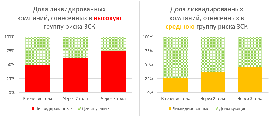 Мы проанализировали статистику ликвидаций юридических лиц, отнесенных к «красной» и «желтой» зоне. Оказалось, что 75% «красных» компаний закрываются в течение 3-х лет, в то время как «желтых» закрывается 46%: